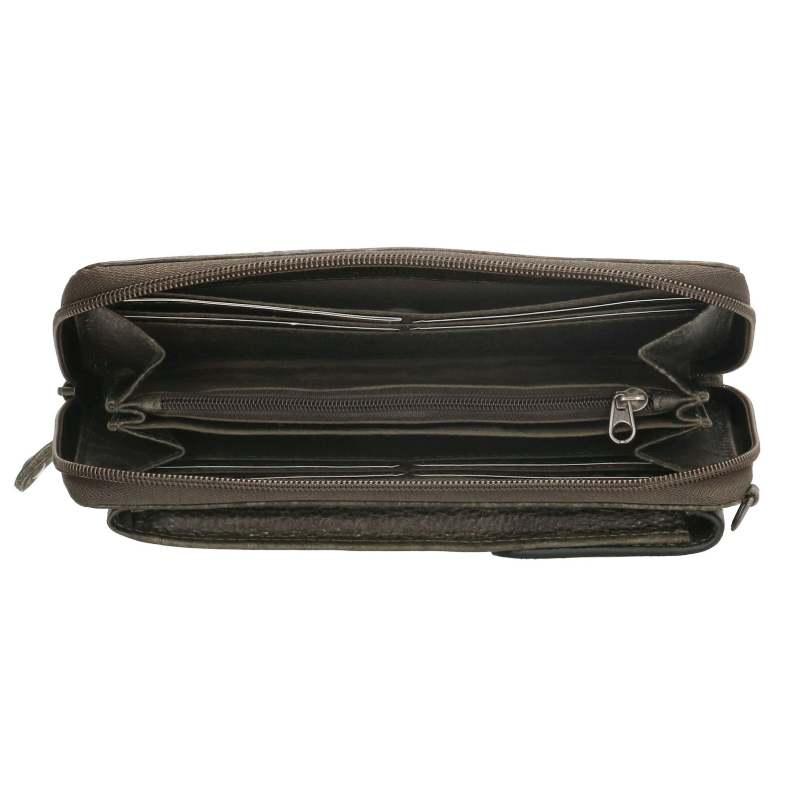 - Hátul cipzáras rekesz, belül három rekesz, két csúszózseb, nyolc kártyahely és egy cipzáras zseb az érmék számára